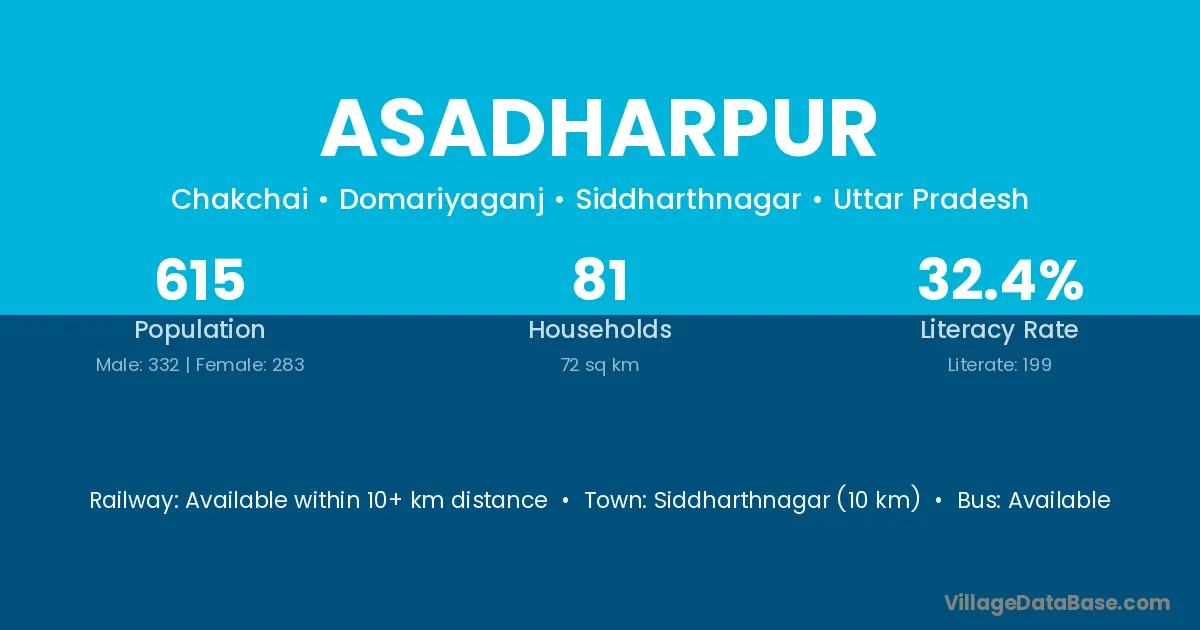 Siddharthnagar (10 km) is the nearest town to Asadharpur village for major economic activities and is located approximately 10 km away.