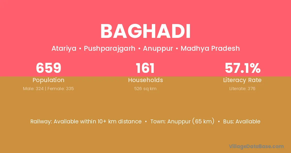 The literacy rate of Baghadi village is 50.47%. Male literacy stands at 59.65% and female literacy at 39.59%.