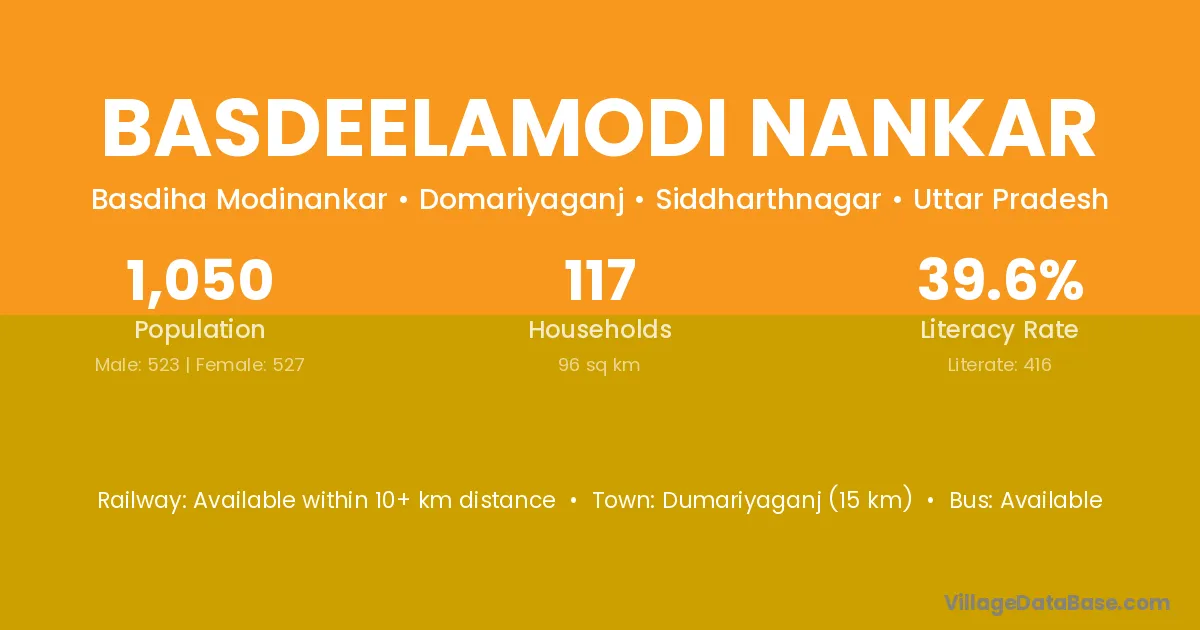 Dumariyaganj (15 km) is the nearest town to Basdeelamodi Nankar village for major economic activities and is located approximately 15 km away.