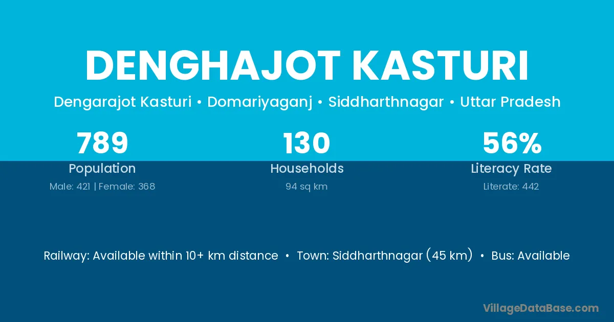 Siddharthnagar (45 km) is the nearest town to Denghajot Kasturi village for major economic activities and is located approximately 45 km away.
