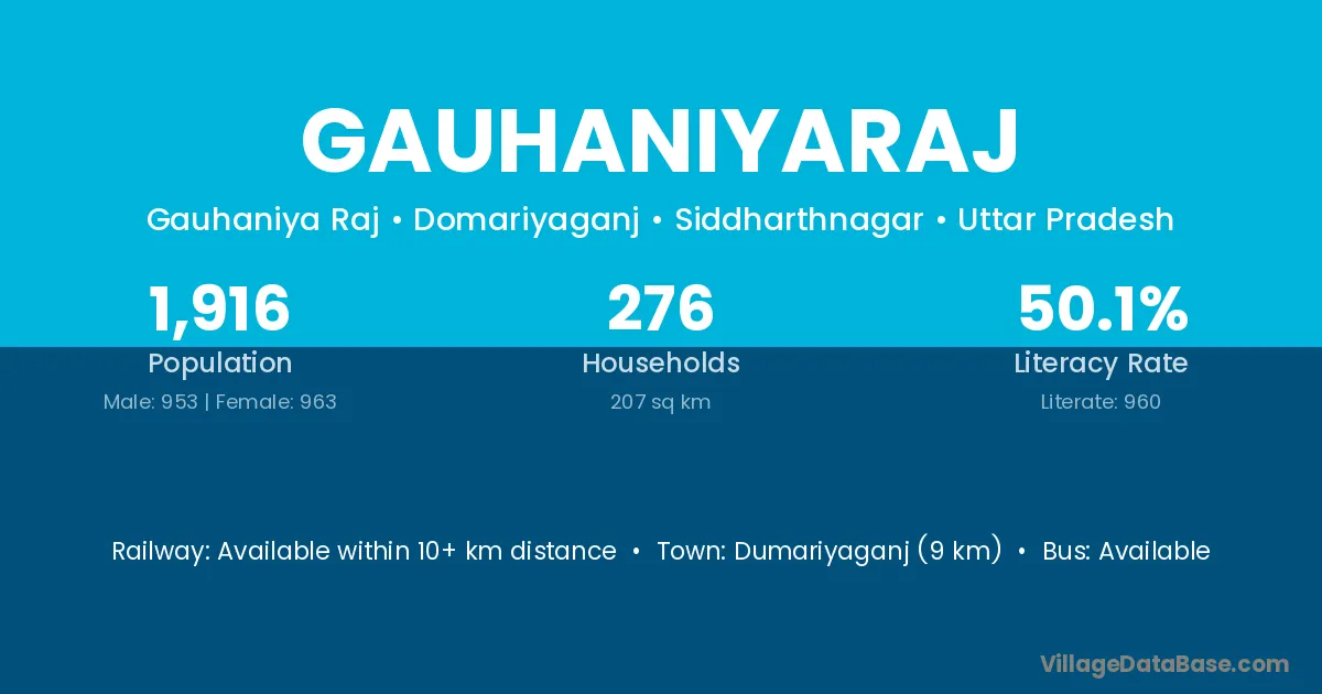 Gauhaniyaraj village has a total population of 1,916 people, of which 953 are males and 963 are females.