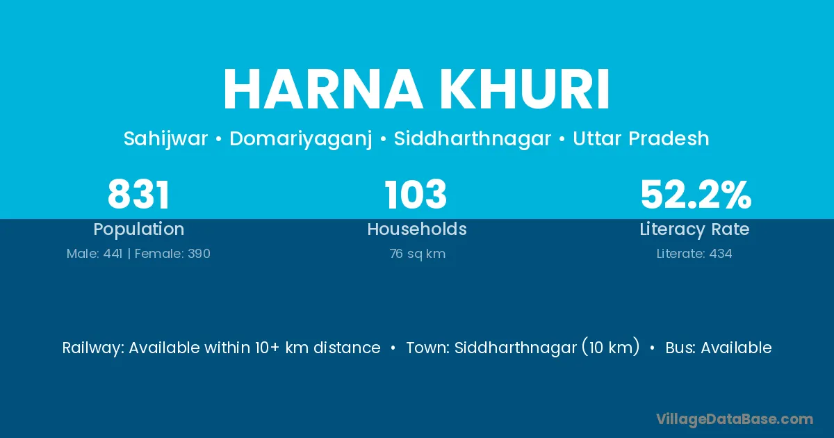 Siddharthnagar (10 km) is the nearest town to Harna Khuri village for major economic activities and is located approximately 10 km away.
