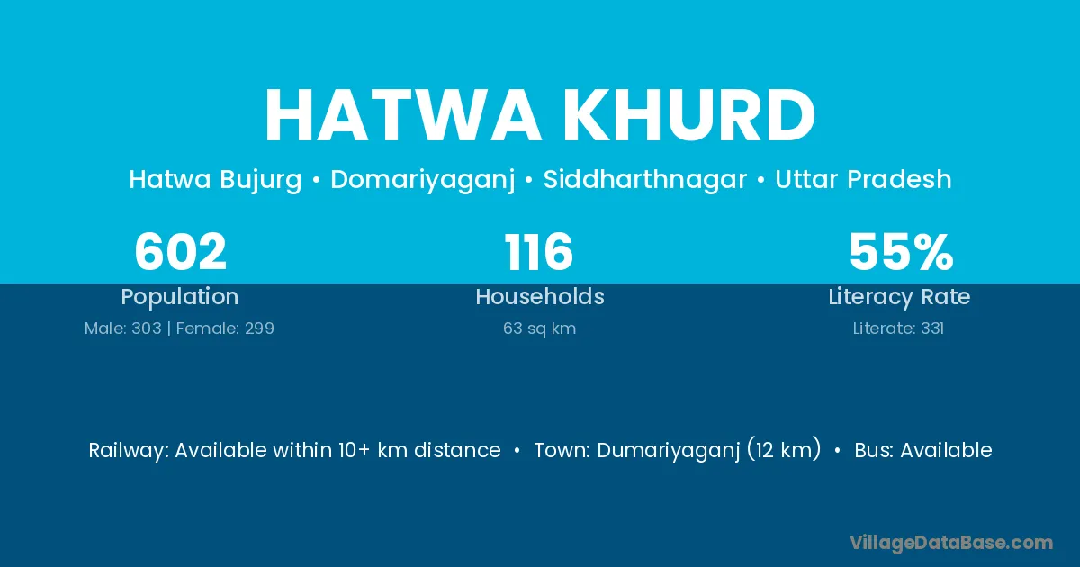 Dumariyaganj (12 km) is the nearest town to Hatwa Khurd village for major economic activities and is located approximately 12 km away.