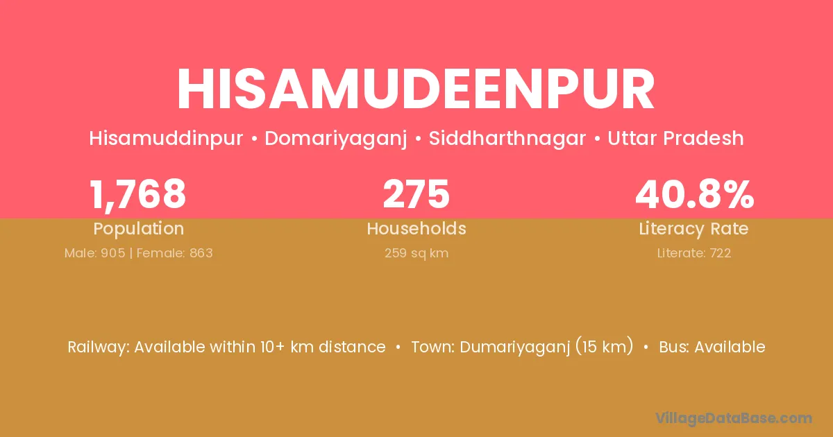 Dumariyaganj (15 km) is the nearest town to Hisamudeenpur village for major economic activities and is located approximately 15 km away.