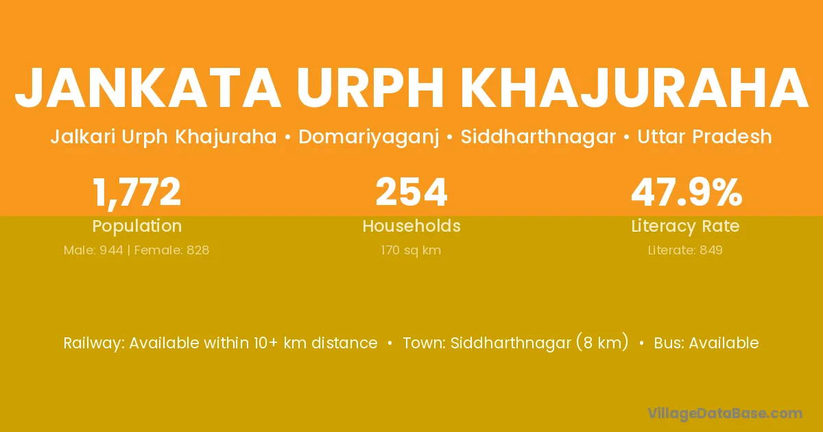 Siddharthnagar (8 km) is the nearest town to Jankata Urph Khajuraha village for major economic activities and is located approximately 8 km away.