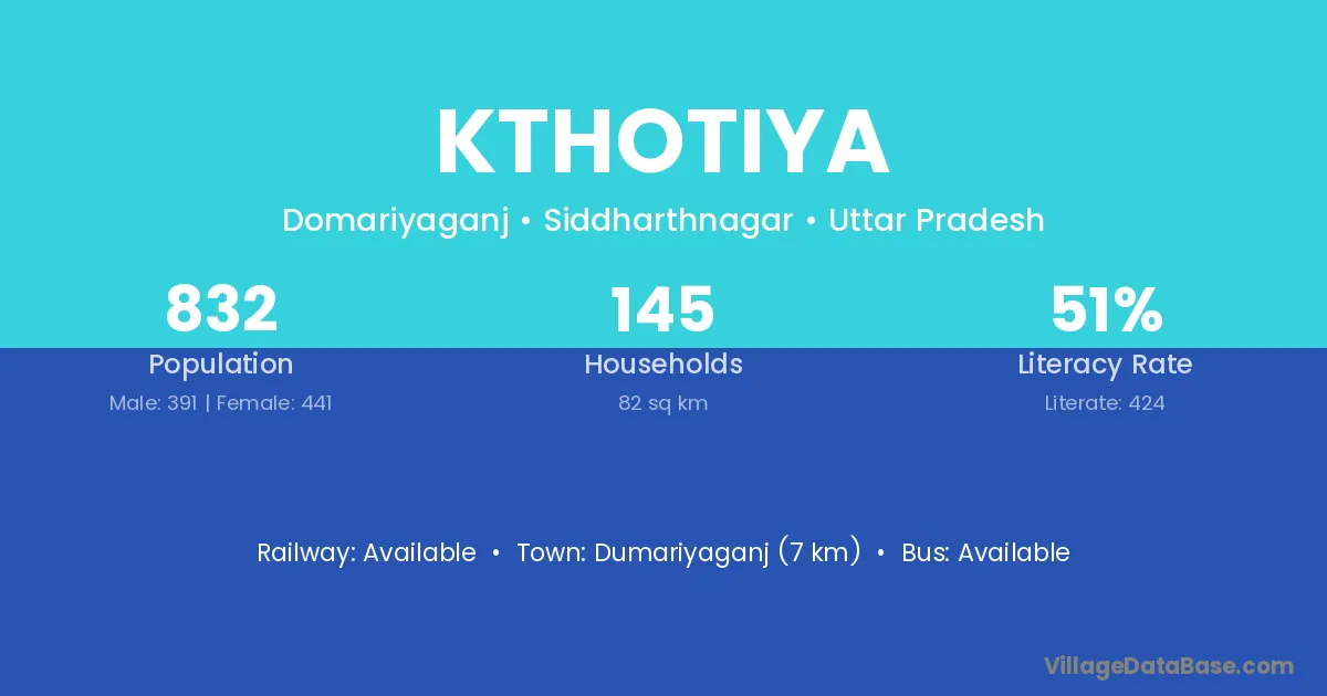 Dumariyaganj (7 km) is the nearest town to Kthotiya village for major economic activities and is located approximately 7 km away.