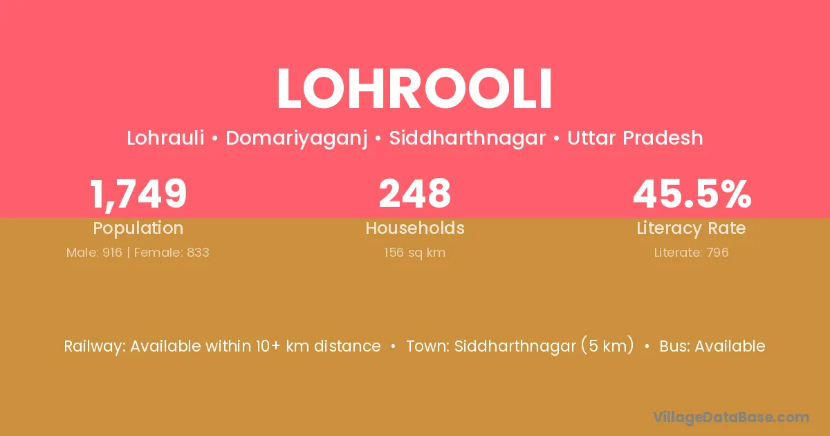 Siddharthnagar (5 km) is the nearest town to Lohrooli village for major economic activities and is located approximately 5 km away.