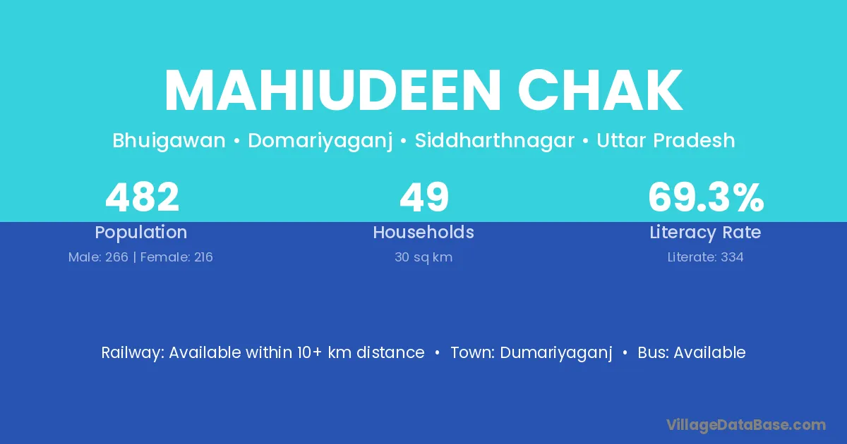 Mahiudeen Chak village has a total population of 482 people, of which 266 are males and 216 are females.