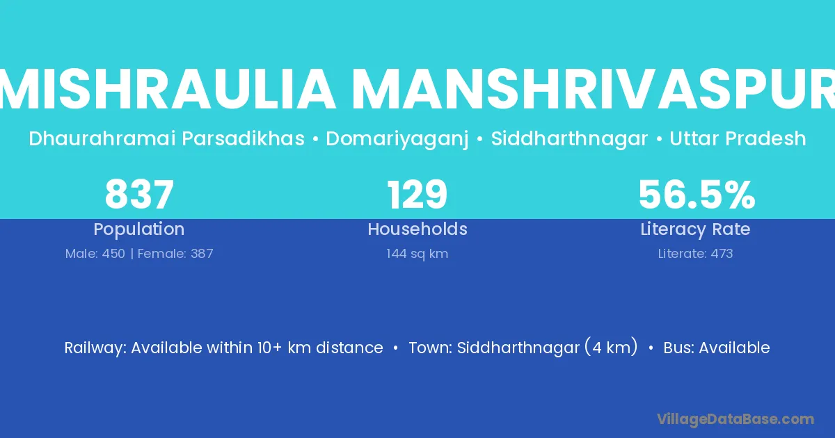 Siddharthnagar (4 km) is the nearest town to Mishraulia Manshrivaspur village for major economic activities and is located approximately 4 km away.