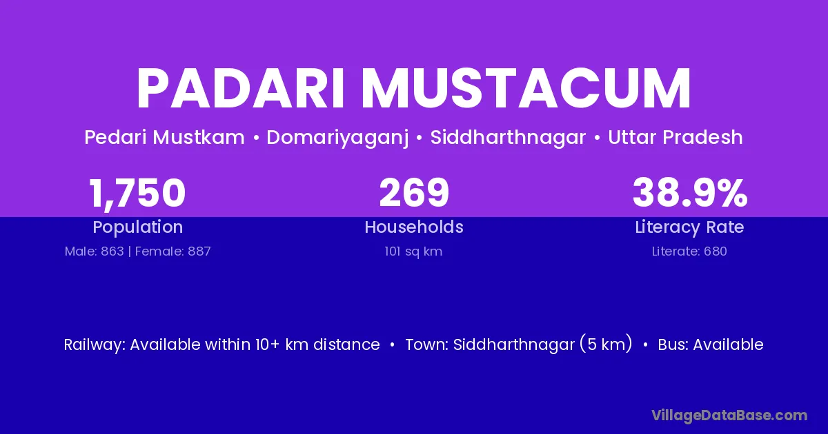 Siddharthnagar (5 km) is the nearest town to Padari Mustacum village for major economic activities and is located approximately 5 km away.
