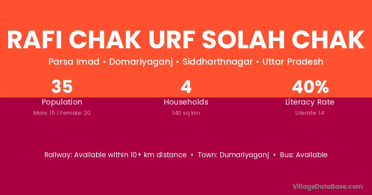 Rafi Chak Urf Solah Chak village has a total population of 35 people, of which 15 are males and 20 are females.
