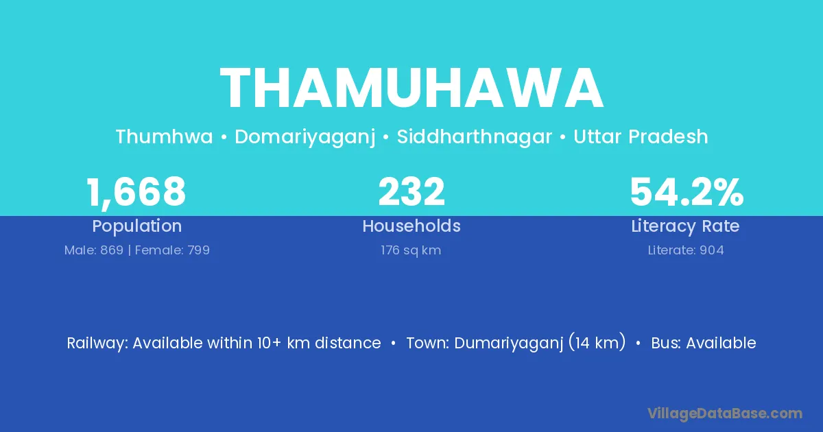 Dumariyaganj (14 km) is the nearest town to Thamuhawa village for major economic activities and is located approximately 14 km away.