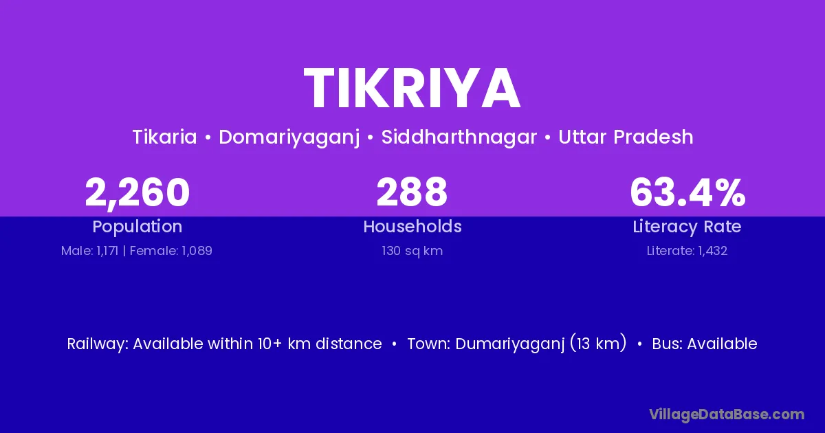 Dumariyaganj (13 km) is the nearest town to Tikriya village for major economic activities and is located approximately 13 km away.