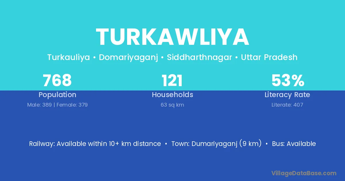 Dumariyaganj (9 km) is the nearest town to Turkawliya village for major economic activities and is located approximately 9 km away.