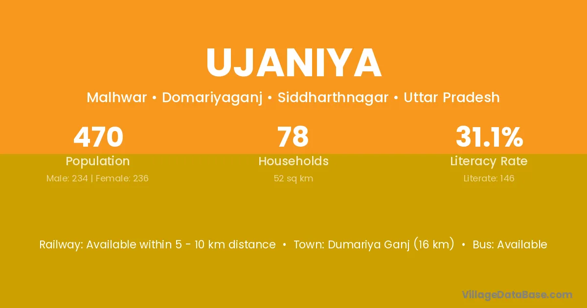 Dumariya Ganj (16 km) is the nearest town to Ujaniya village for major economic activities and is located approximately 16 km away.
