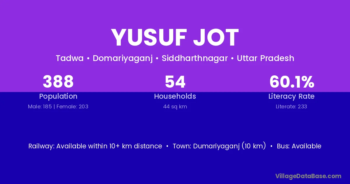 Dumariyaganj (10 km) is the nearest town to Yusuf Jot village for major economic activities and is located approximately 10 km away.