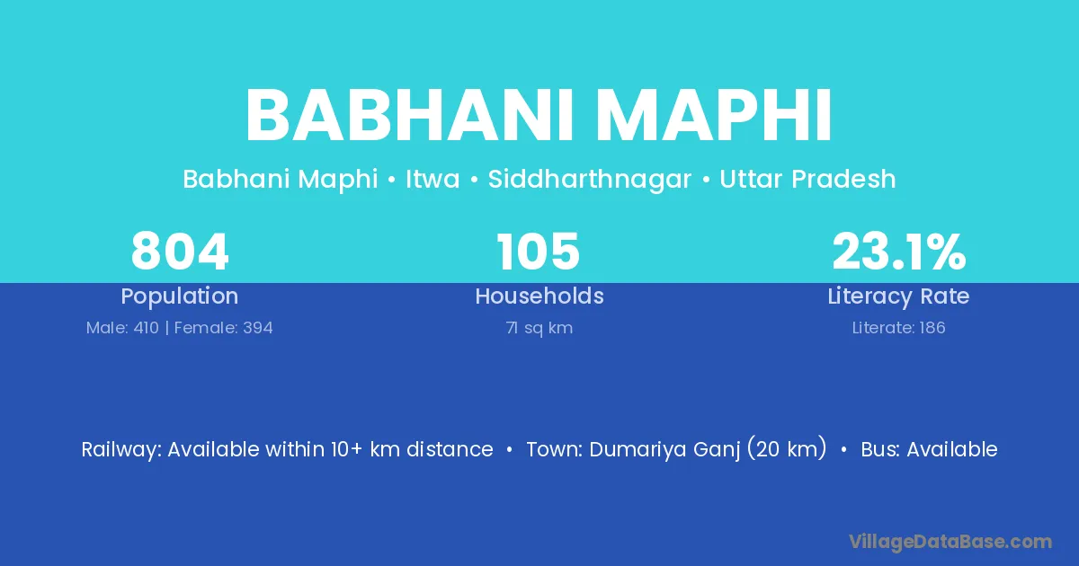 Dumariya Ganj (20 km) is the nearest town to Babhani Maphi village for major economic activities and is located approximately 20 km away.