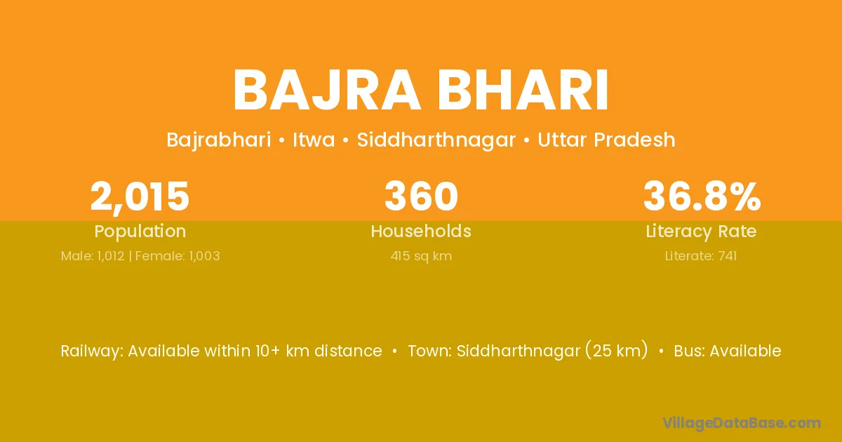 Siddharthnagar (25 km) is the nearest town to Bajra Bhari village for major economic activities and is located approximately 25 km away.