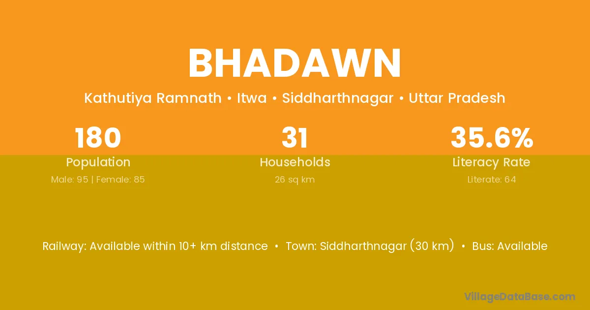 Siddharthnagar (30 km) is the nearest town to Bhadawn village for major economic activities and is located approximately 30 km away.