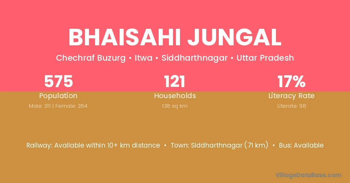 Siddharthnagar (71 km) is the nearest town to Bhaisahi Jungal village for major economic activities and is located approximately 71 km away.