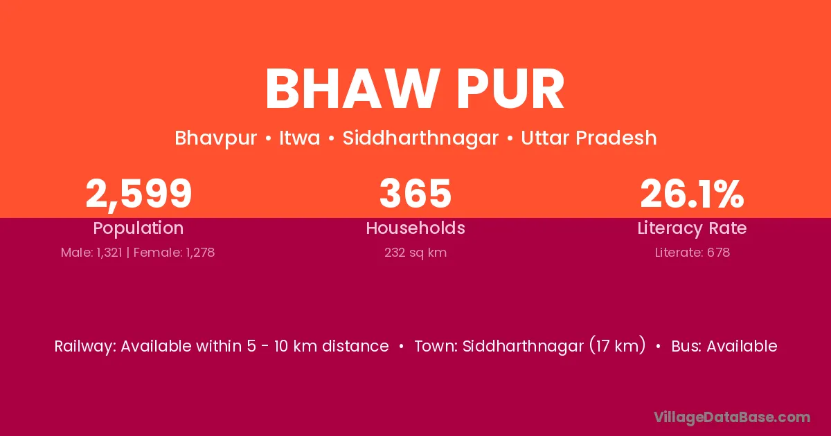 Siddharthnagar (17 km) is the nearest town to Bhaw Pur village for major economic activities and is located approximately 17 km away.