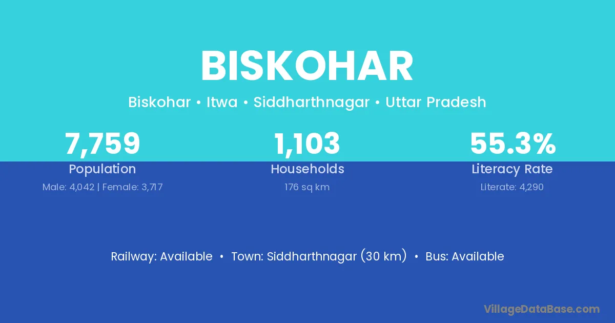 Siddharthnagar (30 km) is the nearest town to Biskohar village for major economic activities and is located approximately 30 km away.