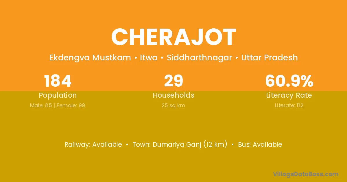Dumariya Ganj (12 km) is the nearest town to Cherajot village for major economic activities and is located approximately 12 km away.