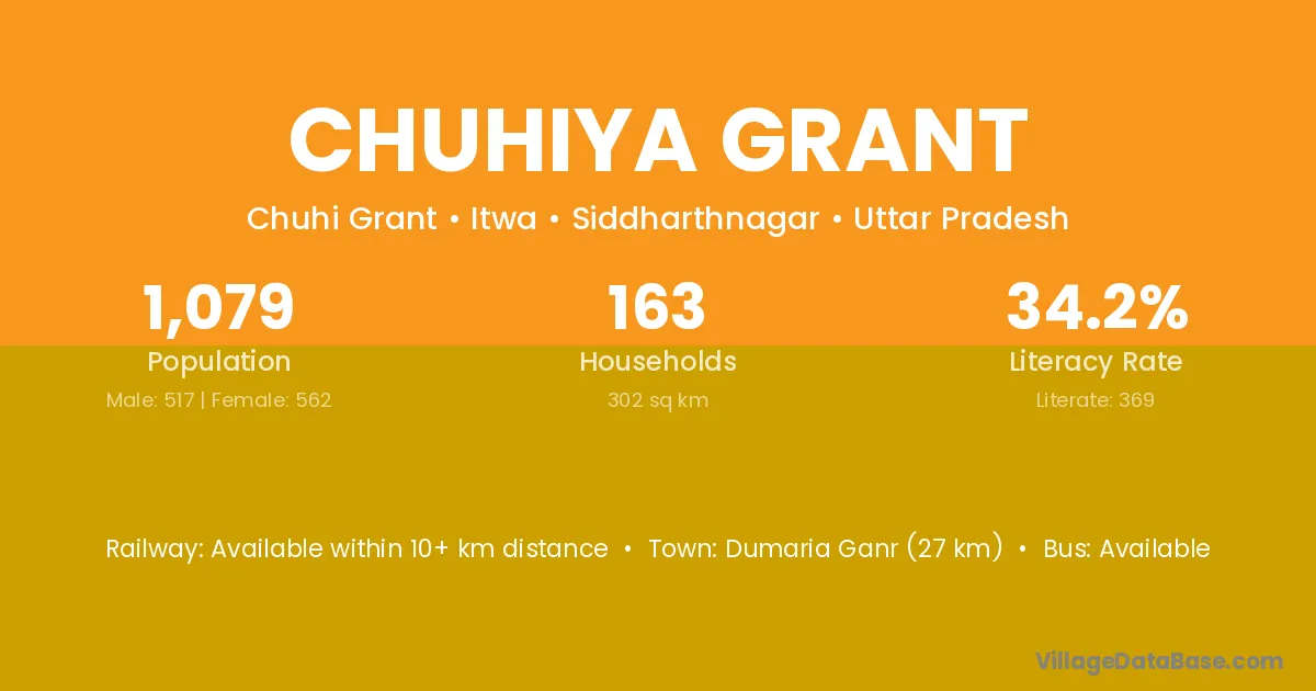Dumaria Ganr (27 km) is the nearest town to Chuhiya Grant village for major economic activities and is located approximately 27 km away.