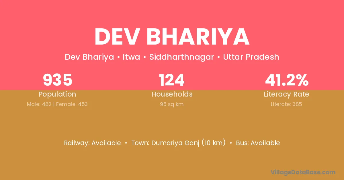 Dumariya Ganj (10 km) is the nearest town to Dev Bhariya village for major economic activities and is located approximately 10 km away.