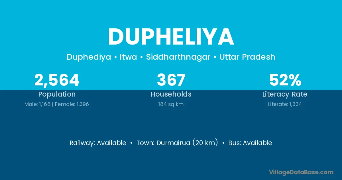 Durmairua (20 km) is the nearest town to Dupheliya village for major economic activities and is located approximately 20 km away.