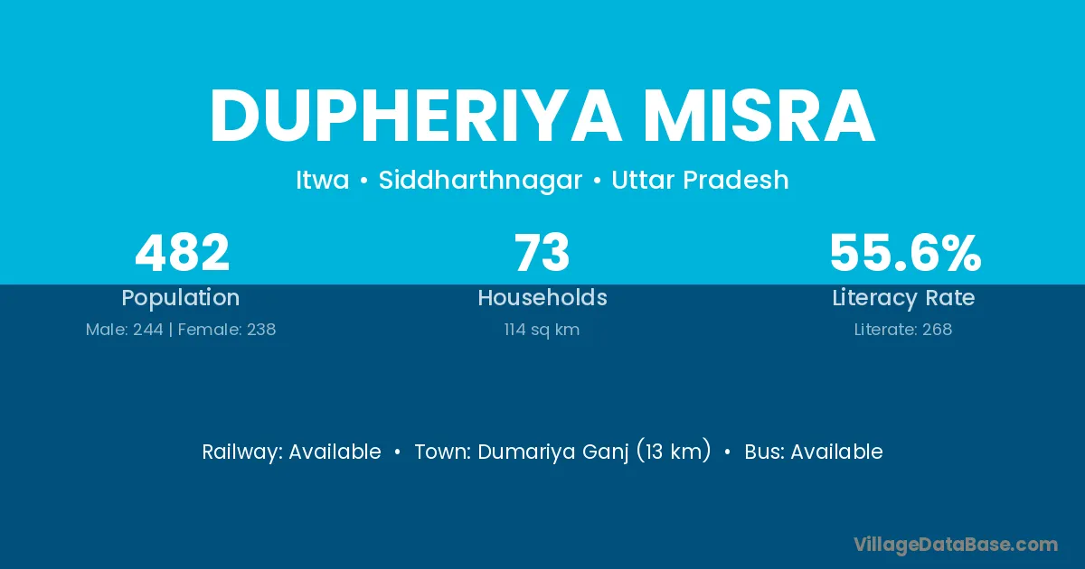 Dumariya Ganj (13 km) is the nearest town to Dupheriya Misra village for major economic activities and is located approximately 13 km away.