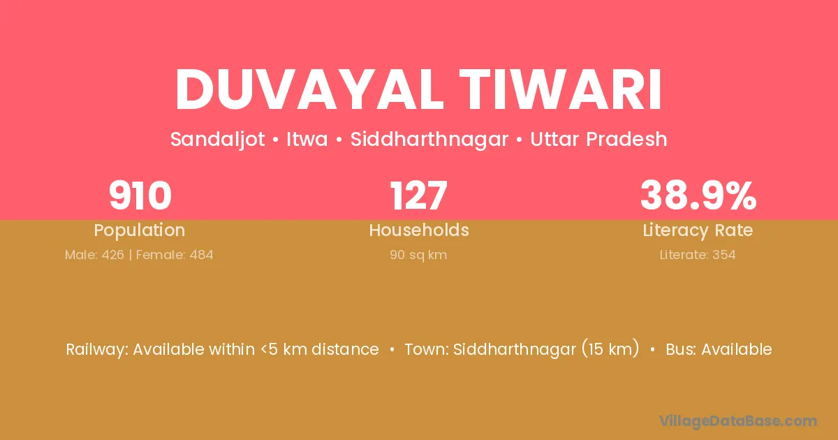 Siddharthnagar (15 km) is the nearest town to Duvayal Tiwari village for major economic activities and is located approximately 15 km away.
