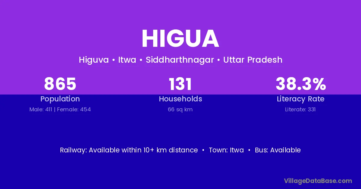 Higua village has a total population of 865 people, of which 411 are males and 454 are females.