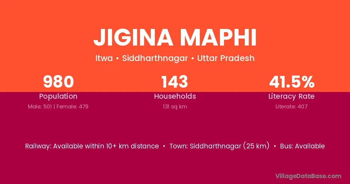 Siddharthnagar (25 km) is the nearest town to Jigina Maphi village for major economic activities and is located approximately 25 km away.