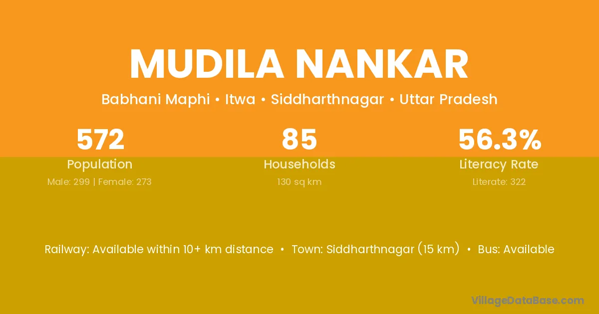 Siddharthnagar (15 km) is the nearest town to Mudila Nankar village for major economic activities and is located approximately 15 km away.