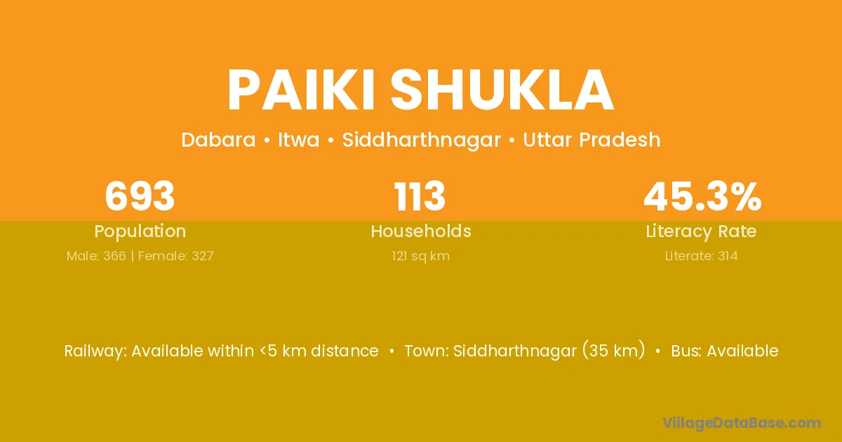 Siddharthnagar (35 km) is the nearest town to Paiki Shukla village for major economic activities and is located approximately 35 km away.