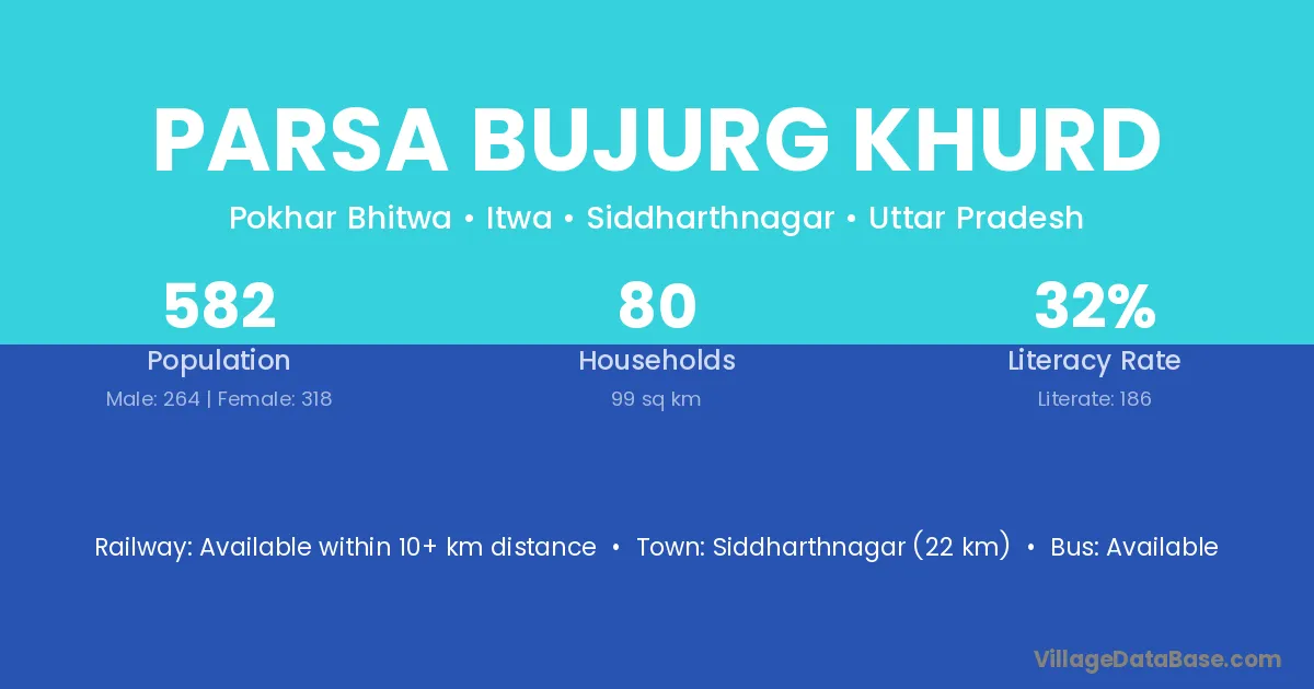 Siddharthnagar (22 km) is the nearest town to Parsa Bujurg Khurd village for major economic activities and is located approximately 22 km away.
