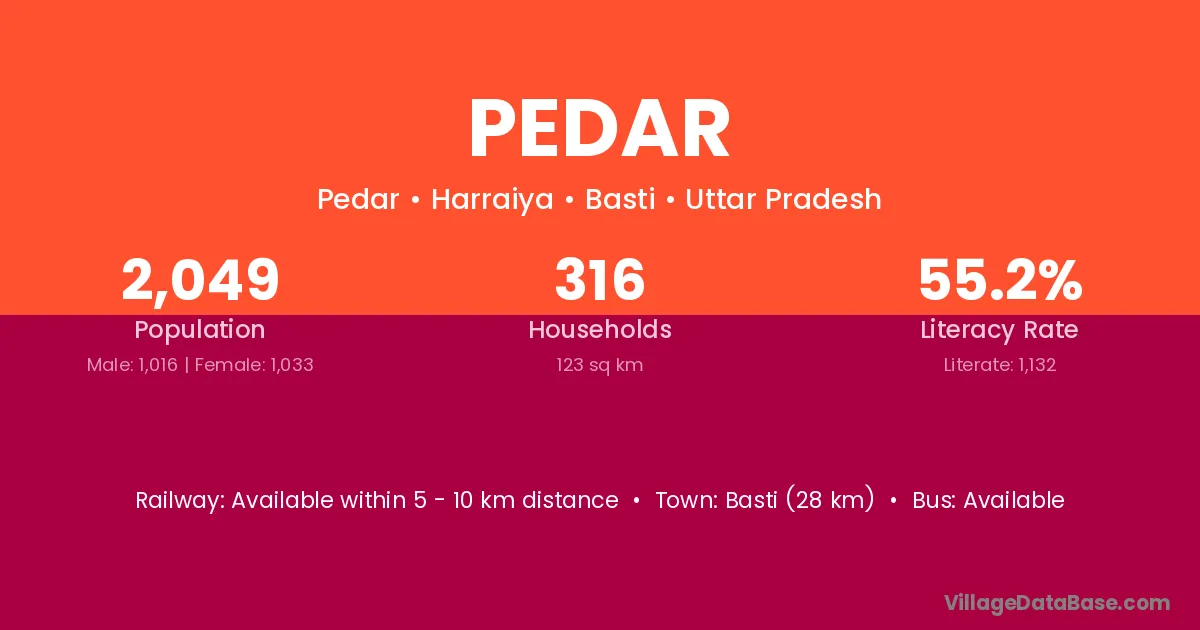 Siddharthnagar (24 km) is the nearest town to Pedar village for major economic activities and is located approximately 24 km away.
