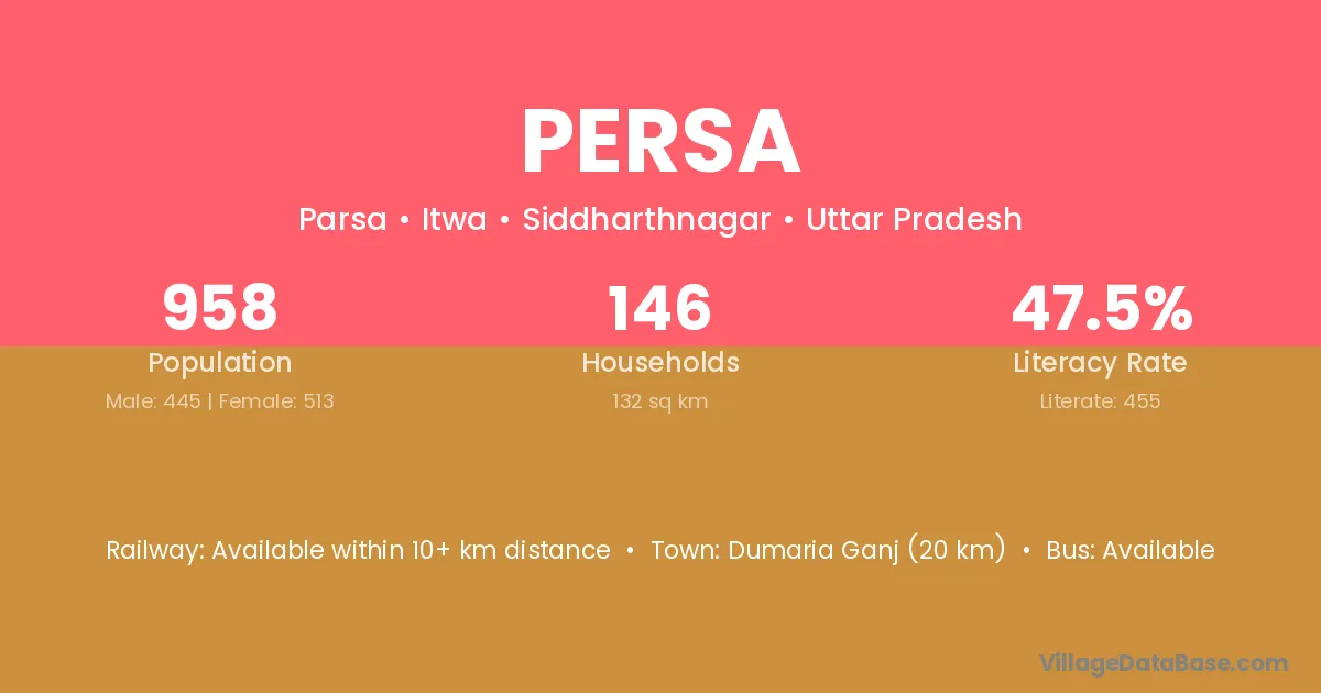 Dumaria Ganj (20 km) is the nearest town to Persa village for major economic activities and is located approximately 20 km away.