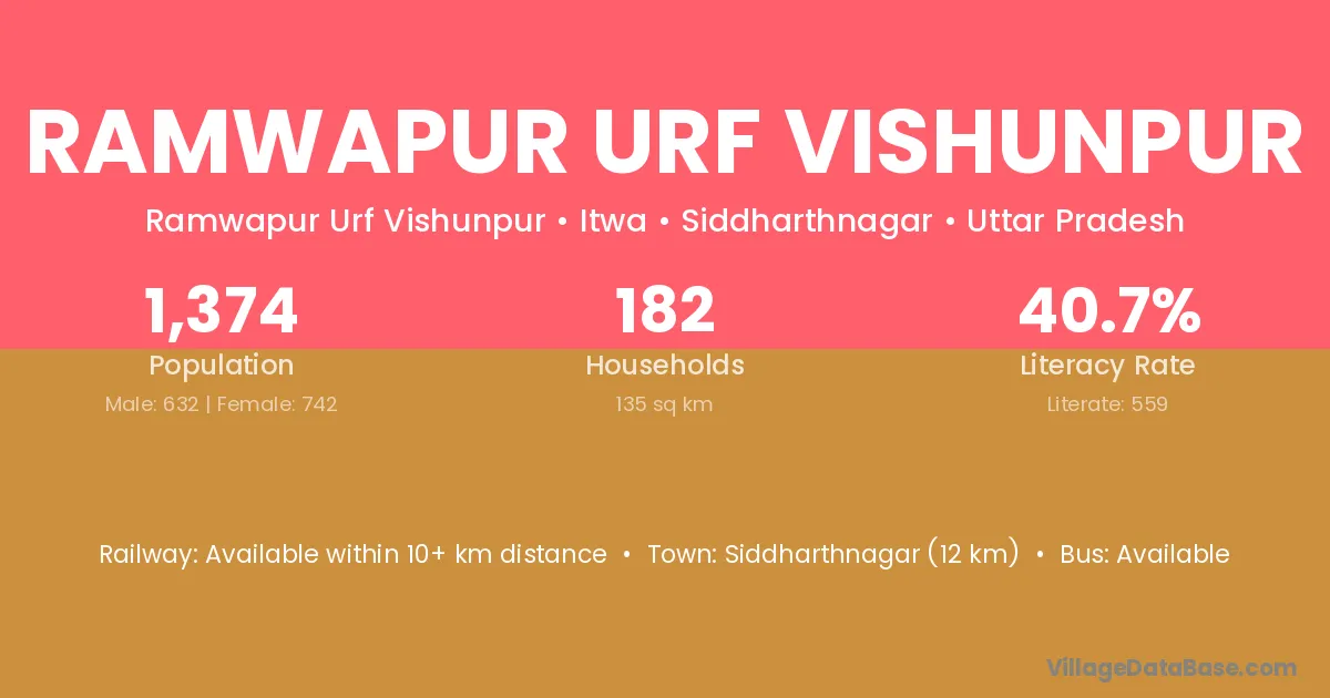 Ramwapur Urf Vishunpur village has a total population of 1,374 people, of which 632 are males and 742 are females.