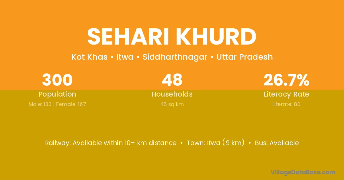 Itwa (9 km) is the nearest town to Sehari Khurd village for major economic activities and is located approximately 9 km away.