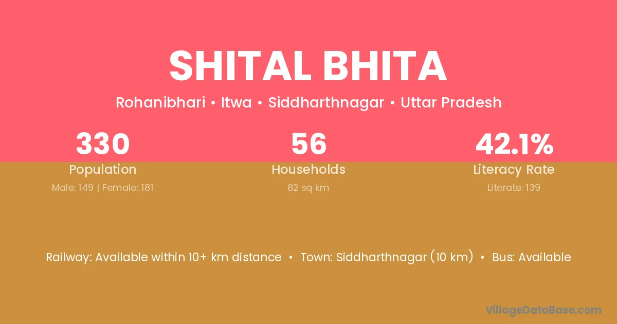 Siddharthnagar (10 km) is the nearest town to Shital Bhita village for major economic activities and is located approximately 10 km away.