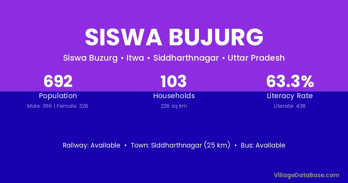 Siddharthnagar (25 km) is the nearest town to Siswa Bujurg village for major economic activities and is located approximately 25 km away.