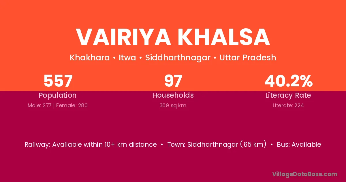 Siddharthnagar (65 km) is the nearest town to Vairiya Khalsa village for major economic activities and is located approximately 65 km away.