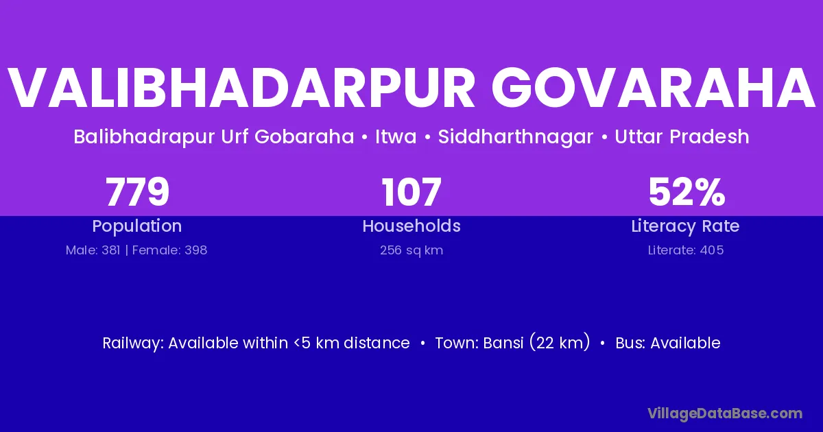 Bansi (22 km) is the nearest town to Valibhadarpur Govaraha village for major economic activities and is located approximately 22 km away.