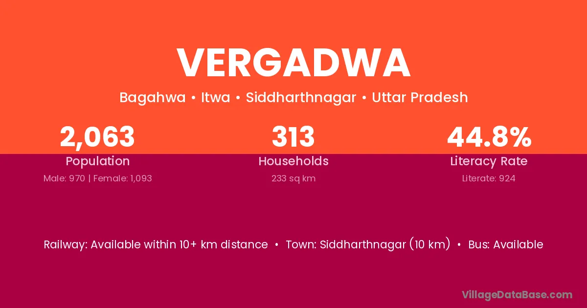 Siddharthnagar (10 km) is the nearest town to Vergadwa village for major economic activities and is located approximately 10 km away.