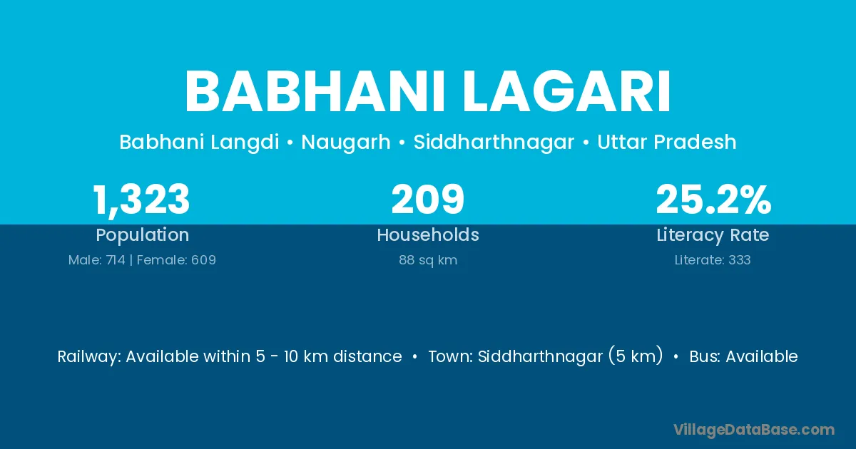 Siddharthnagar (5 km) is the nearest town to Babhani Lagari village for major economic activities and is located approximately 5 km away.