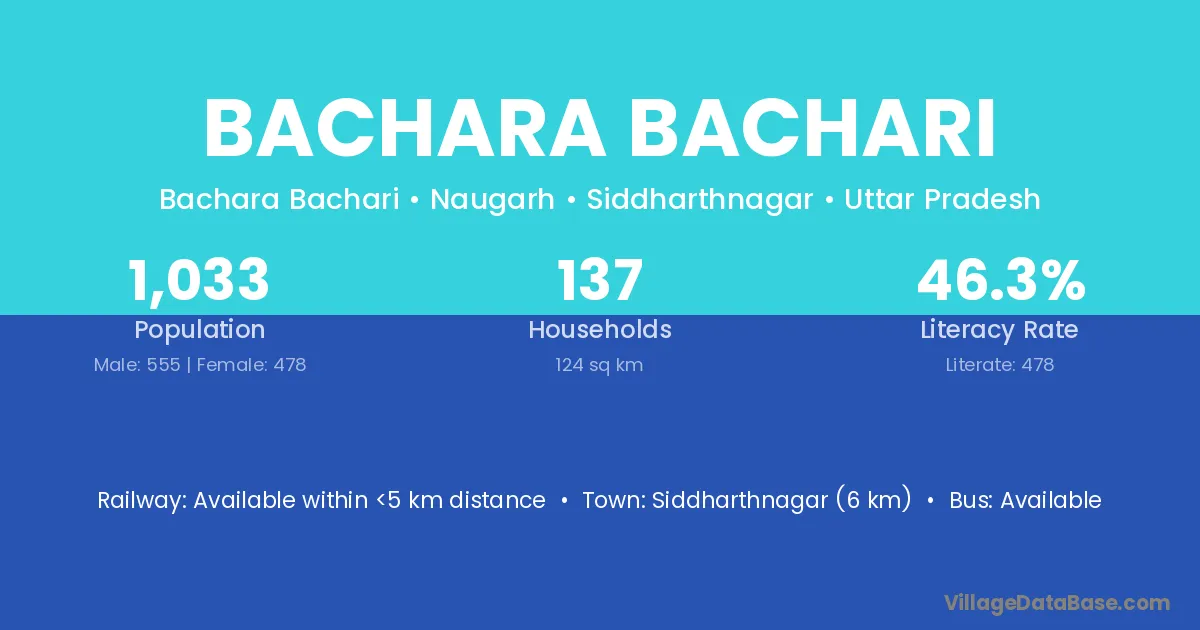 Siddharthnagar (6 km) is the nearest town to Bachara Bachari village for major economic activities and is located approximately 6 km away.
