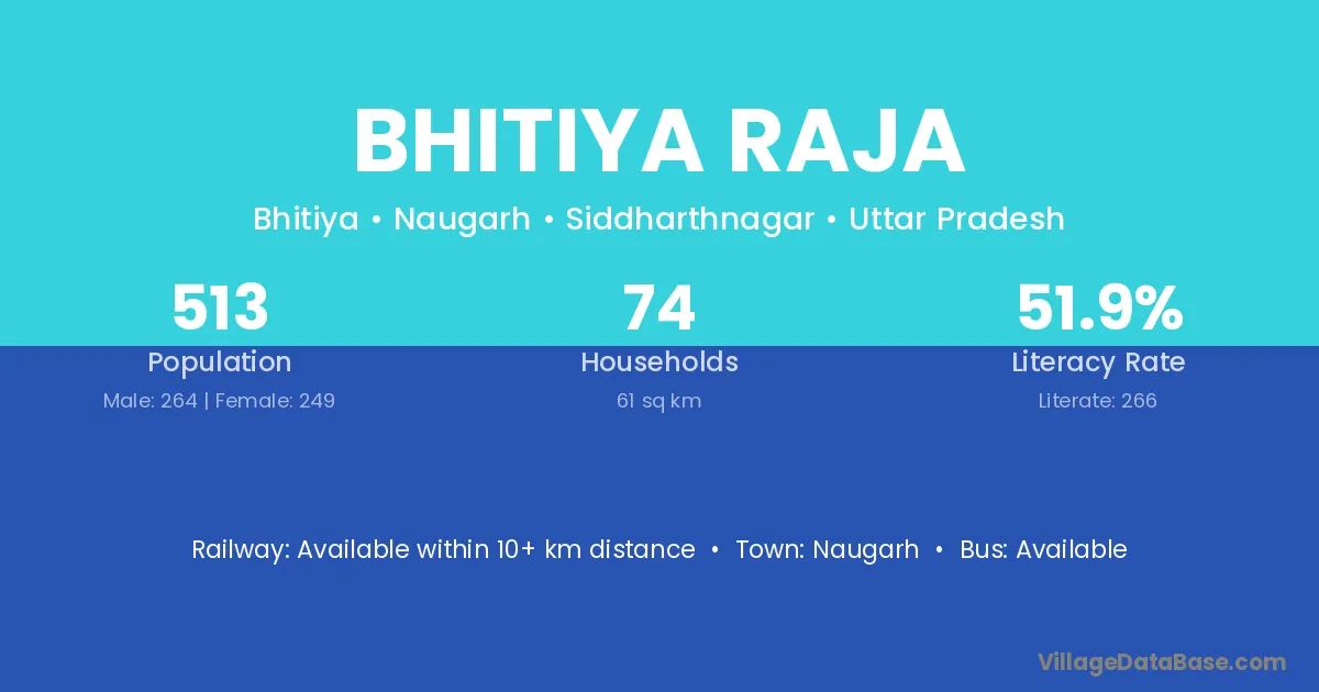 Bhitiya Raja village has a total population of 513 people, of which 264 are males and 249 are females.