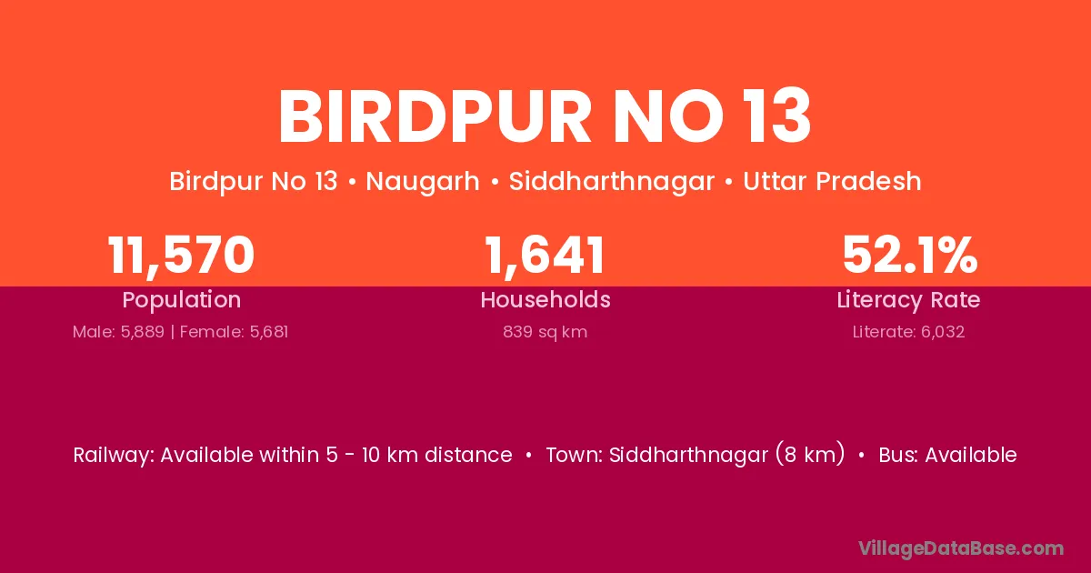 Birdpur No 13 village has a total population of 11,570 people, of which 5,889 are males and 5,681 are females.